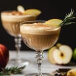 A sophisticated and cozy Apple Caramel Espresso Martini that combines rich espresso, autumnal apple syrup, and creamy dairy-free condensed milk for a decadent vegan cocktail. This recipe includes a homemade Kahlua substitute and is garnished with fresh Granny Smith apple slices, rosemary, and a drizzle of vegan caramel sauce.