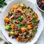 This Autumn Quinoa Salad is a vibrant, nutrient-packed dish perfect for fall. Featuring roasted brussels sprouts and butternut squash seasoned with aromatic spices, combined with fluffy quinoa and a tangy honey mustard vinaigrette. Toasted pecans and dried cranberries add texture and sweetness, making it a wholesome and delicious salad suitable for vegetarians when using vegetable broth.