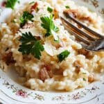 This creamy Bacon Risotto recipe features crispy bacon, tender Arborio rice, and a rich blend of Parmesan cheese and fresh parsley, creating a comforting and flavorful Italian-inspired dish perfect for a hearty meal.