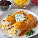 This Baked Chicken Wet Burrito is a flavorful and satisfying meal featuring tender shredded chicken, black beans, corn, rice, and cheddar cheese wrapped in a warm tortilla, baked with enchilada sauce and melted cheese on top. Perfect for a comforting lunch or dinner, it’s easy to prepare and deliciously cheesy.