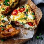 Keywords: baked egg tortilla, tortilla quiche, breakfast quiche, spinach egg bake, easy breakfast recipes, vegetarian quiche