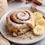 For special occasions, I’ve arranged banana cinnamon rolls on a pretty platter lined with banana leaves here and there for a tropical vibe. Another fun presentation is to serve each roll in a small ramekin with a dollop of peanut butter frosting on the side for dipping—kids and adults both love that little twist!