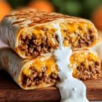 These Beefy Melt Burritos are a delicious and satisfying meal featuring seasoned ground beef, melty cheddar and nacho cheese sauce, tender white rice, and creamy sour cream all wrapped in warm, toasted flour tortillas. Perfect for a hearty lunch or dinner, they combine classic Tex-Mex flavors with a comforting cheesy twist.