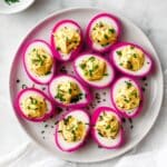 Leftover Beet Pickled Deviled Eggs keep well covered in the fridge for up to 3 days. I store them in an airtight container lined with paper towel to absorb any extra moisture. The beet color can deepen over time, which is totally fine and still lovely to eat.