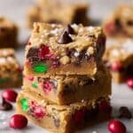Keywords: brown butter cookie bars, M&M cookie bars, holiday cookie bars, chocolate chip cookie bars, easy cookie bars, festive desserts