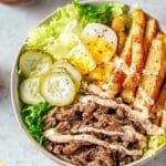I usually reheat the beef and potatoes in a skillet over medium heat to revive their crispiness, adding a splash of water or oil if things get too dry. The creamy sauce is best served cold or at room temperature, so add it fresh when serving. This way, your burger bowl tastes almost like freshly made!