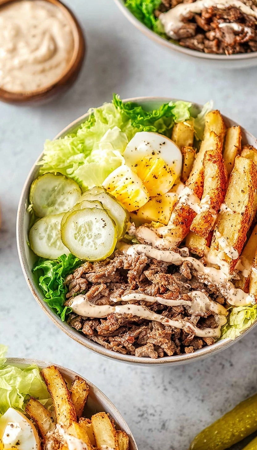 Grab your bowls and start by layering the roasted potatoes at the bottom, then pile on the spiced beef. Add a generous handful of shredded lettuce for freshness, your choice of cheese, and several pickle slices for that signature tang. Drizzle over the creamy sauce, and if you’re like me, you might add a little extra on the side for dipping. Simple, satisfying, and ready to enjoy!