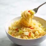 Reheating is easiest in a skillet over medium heat—you just want to warm it through without letting the noodles get mushy. Add a splash of water or broth if it seems dry. I avoid microwaving because it tends to overcook the cabbage and make the texture less pleasant, but if you’re in a pinch, use short bursts and stir often.