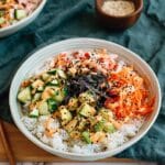 Whether you prefer to mix everything together or arrange ingredients in neat sections over your rice, it’s all about fresh textures here. I love the contrast of cool cucumber and creamy avocado mixed with the savory crab and nori. This step is your chance to make it look as colorful and inviting as you want!
