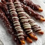 Now for the fun part! Dip the caramel-coated pretzels into the melted chocolate, or drizzle the chocolate over them with a spoon or fork if you want to keep some caramel showing. Before the chocolate sets, sprinkle flaky sea salt generously on top—this contrast is what really makes these pretzel rods pop with flavor.