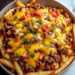 Top everything off with a generous layer of shredded cheese. I usually use sharp cheddar for a nice tang, but American cheese gives it that super classic diner feel. Bake uncovered at 375°F (190°C) for about 25 to 30 minutes until the fries are crisp and the cheese is bubbling and golden on top. Keep an eye near the end to make sure it doesn’t over-brown.
