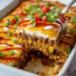 This Cheesy Mexican Lasagna is a flavorful, layered casserole combining seasoned ground meat, rice, tortillas, and sharp cheddar cheese. Perfect for a quick weeknight dinner, it’s baked until bubbly and golden, then topped with fresh garnishes for an authentic Mexican-inspired comfort meal.
