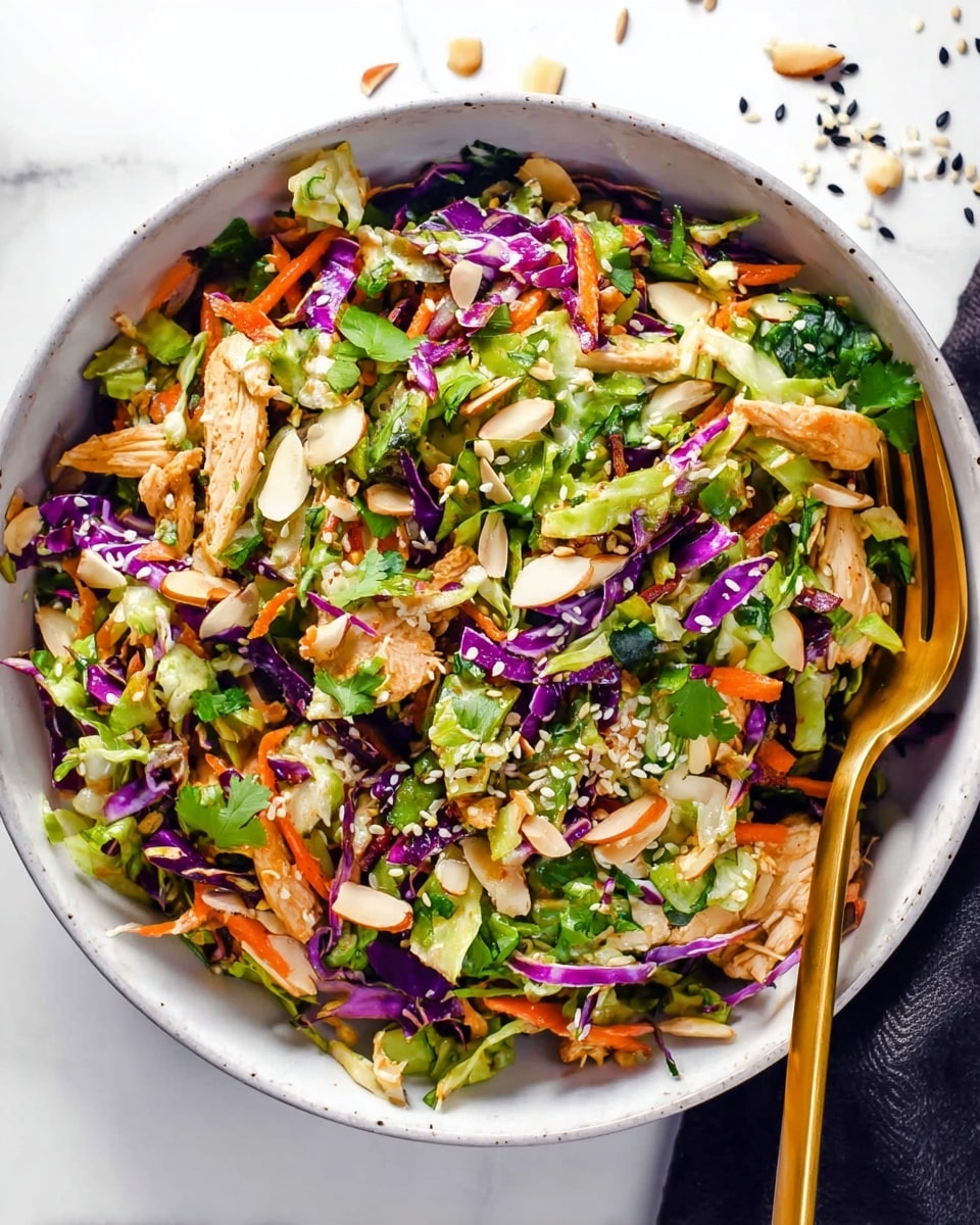 A crisp and refreshing Chinese Chicken Salad featuring a vibrant mix of napa and red cabbage, shredded carrots, and tender chicken, tossed with a tangy ginger-soy dressing. Topped with crunchy almonds and sesame seeds for additional texture and flavor. Perfect for a light lunch or dinner.