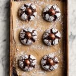 I store leftover cookies in an airtight container at room temperature to keep them soft and fudgy for up to 4 days. It’s best to layer them between sheets of parchment paper so they don’t stick together or lose that pretty crinkle coating.
