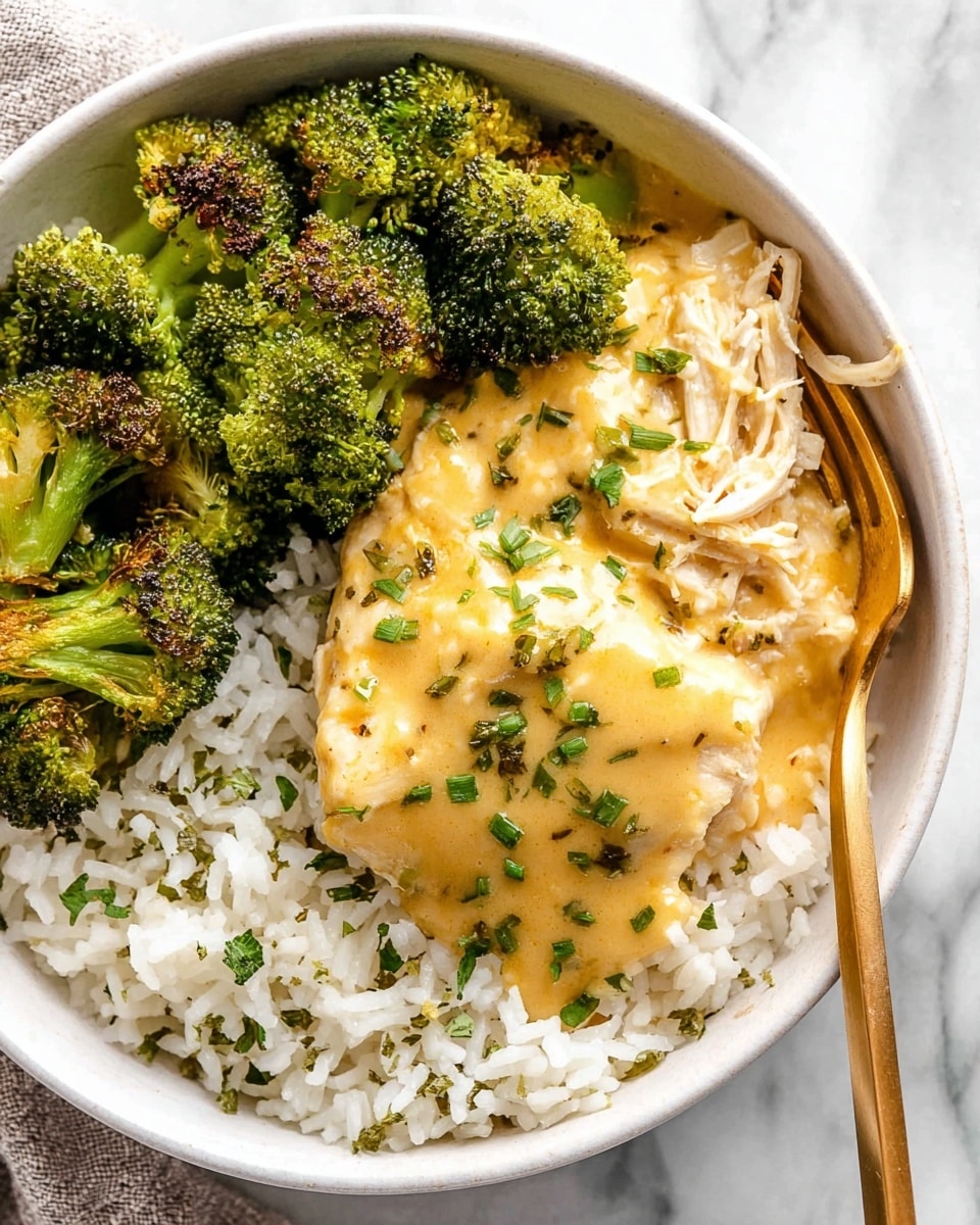 Once your chicken is cooked, you can shred it right in the crockpot or leave the breasts whole. I usually fluff some cooked white rice and spoon the chicken mixture over it for a comforting, complete meal. Don’t forget to stir the sauce a bit to mix in all that buttery goodness.