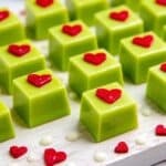 Celebrate the holidays with this festive Christmas Mini Grinch Fudge Recipe! Creamy white chocolate fudge is beautifully tinted electric green and topped with adorable red heart sprinkles, capturing the mischievous spirit of the Grinch. Easy to make and perfect for gifting or party treats, this rich, sweet fudge is sure to become a holiday favorite.