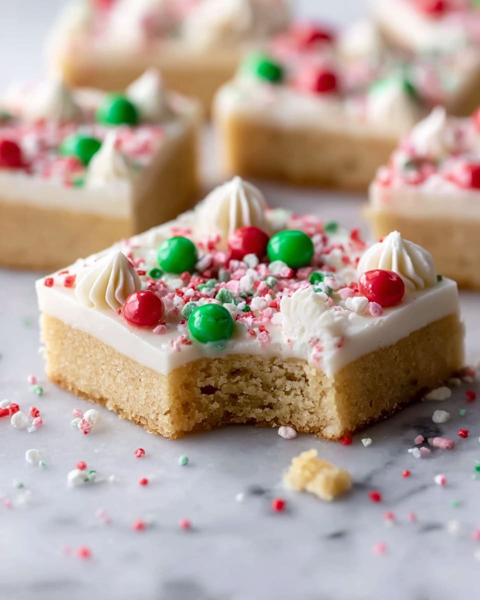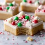 - Frost and Decorate: Once the cookie bars are fully cooled, spread the frosting evenly over the top. Immediately sprinkle Christmas sprinkles over the frosting before it sets to create a festive appearance. Slice into bars and serve.