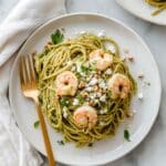 - Serve: Plate the pesto-coated pasta and top with sautéed shrimp. Garnish with 1/4 cup crumbled goat cheese, extra fresh cilantro leaves, and a sprinkle of chopped roasted pistachios for added texture and flavor. Serve immediately while warm.