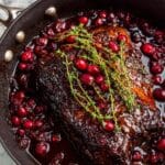 - Make the Cranberry Sauce: While the roast rests, place the skillet or roasting pan used for searing over medium heat. Add beef broth, cranberries, and thyme sprigs. Simmer for 10-15 minutes, stirring occasionally, until the cranberries burst and the sauce thickens slightly.