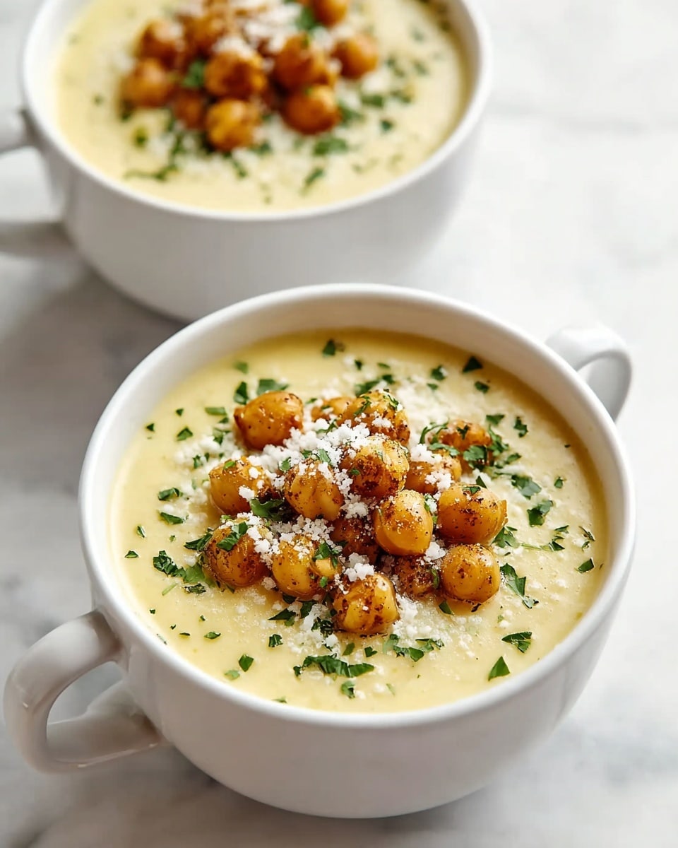 - Serve the soup: Ladle the creamy soup into bowls and garnish with sautéed cauliflower florets, roasted chickpeas, fresh thyme leaves, extra Parmesan cheese, and a crack of black pepper for added texture and flavor.