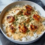 This Creamy Smothered Chicken and Rice recipe features tender seared chicken breasts simmered in a rich, cheesy sauce served over fluffy white rice. Flavored with garlic, smoked paprika, and herbs, this comforting one-pan meal is perfect for a cozy family dinner.