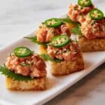 Top each crispy rice cake with a generous spoonful of the spicy salmon mixture. Garnish with thin avocado slices, jalapeño, toasted sesame seeds, and a drizzle of sweet chili sauce and extra sesame oil for that finishing touch. Serve immediately to enjoy the contrast of warm crispy rice with cool creamy salmon.