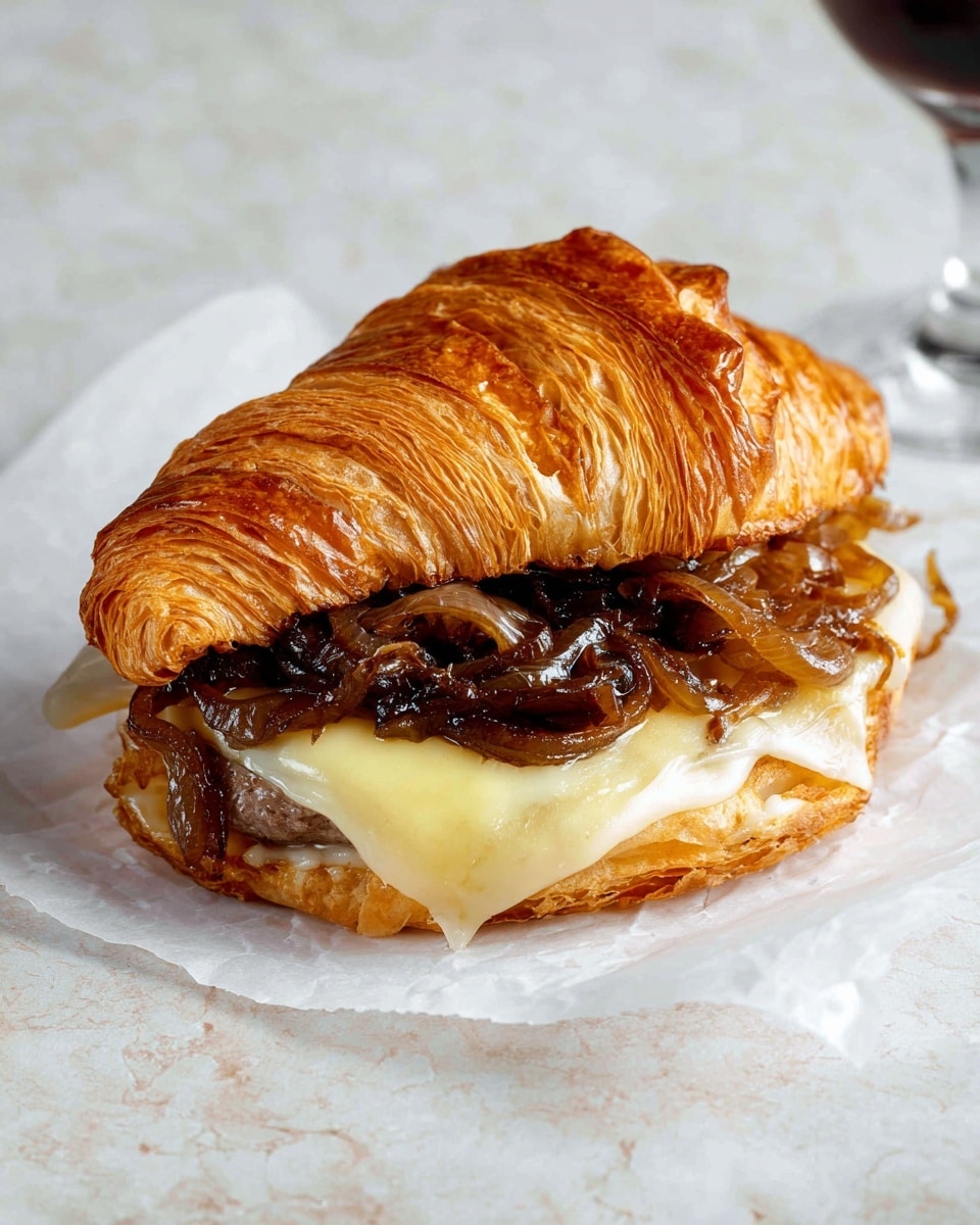 A decadent and flavorful Croissant Burger recipe combining juicy ground beef, caramelized onions, melted cheddar, and a tangy homemade sauce, all nestled inside buttery, flaky croissants.