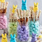 Celebrate Easter with these delightful Easter Pretzel Rods featuring crunchy pretzels coated in creamy white chocolate, sprinkled with colorful crushed pastel M&M candies, and elegantly drizzled with candy melts for a festive treat perfect for gatherings and celebrations.