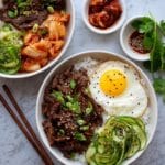 Freezing works great for the marinated beef before cooking, but I don’t recommend freezing the assembled bowls as the cucumbers and fried eggs don’t freeze well. Just freeze the beef in portions and thaw overnight before cooking.