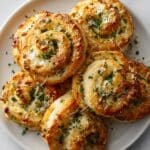 These EASY HIGHER PROTEIN GARLIC SWIRLS are a delicious gluten-free snack or side made with protein-rich fat-free Greek yogurt and bursting with garlic and parmesan flavors. Perfectly golden and flaky, these swirls are simple to prepare and ideal for serving warm alongside your favorite marinara or arrabbiatta sauce.