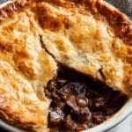 This English Steak and Mushroom Pie Recipe freezes beautifully. I usually freeze before baking, wrapped tightly in plastic and then foil, which helps keep the pastry fresh. When ready to enjoy, thaw overnight in the fridge, then bake as instructed—just give it a few extra minutes to cook through.