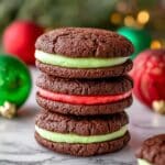 These festive Christmas Whoopie Pies feature soft, rich devil’s food cake cookies sandwiched with a creamy marshmallow cream cheese filling tinted in vibrant red and green, perfect for holiday celebrations and gifting.