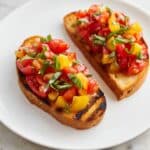 Freezing bruschetta isn’t something I recommend because the fresh tomato mixture loses its texture when thawed and the bread gets soggy. It’s best enjoyed fresh, so plan to make just enough for your gathering.