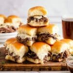 For parties, I sometimes arrange these sliders on a large wooden board alongside small bowls of au jus for dipping and individual toothpicks in each sandwich. It looks inviting and guests love the interactive feel of dunking their sliders. You can also layer some caramelized onions and cheese on top instead of inside for a rustic look.