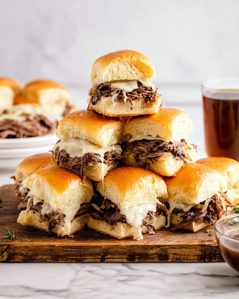 Keywords: French Dip Sliders, Roast Beef Sliders, Slider Recipe, French Onion Au Jus, Party Appetizers, Comfort Food