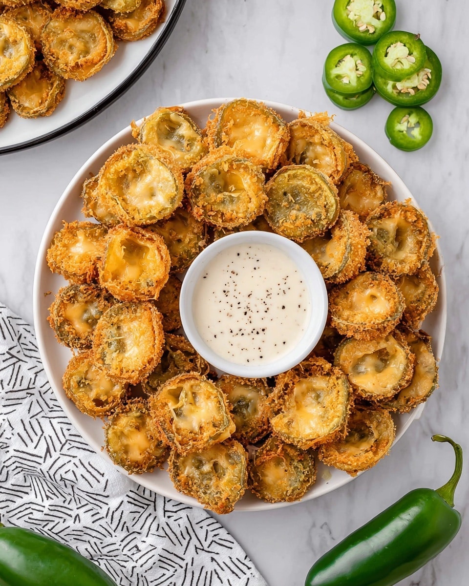 Crispy, beer-battered fried jalapeño slices make a flavorful and spicy appetizer or snack, perfectly paired with ranch dressing for cooling contrast.