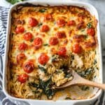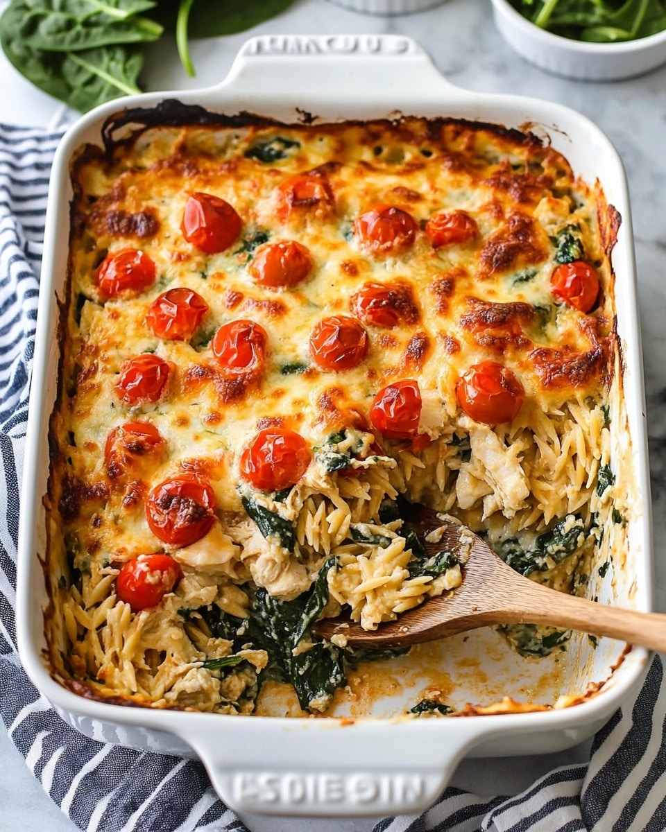 This Greek Chicken Orzo Bake is a comforting and delicious one-pan meal featuring tender chicken, creamy orzo pasta, fresh spinach, and juicy tomatoes, all baked together with mozzarella and parmesan cheeses for a hearty Mediterranean-inspired dish.