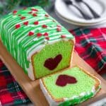 The Green Grinch Cake is a festive, colorful dessert perfect for holiday celebrations, featuring a vibrant red velvet heart-shaped core encased in a green pistachio-flavored cake. This layered cake combines the rich flavors of red velvet and pistachio pudding cake, topped with smooth white and green icing and decorated with red heart sprinkles for a whimsical touch.