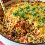 This Ground Beef Rice Skillet recipe is a hearty and flavorful one-pan meal perfect for a quick and satisfying dinner. Ground beef is browned with onions and garlic, then simmered with diced tomatoes, green chiles, beef stock, and long grain rice, all cooked together until tender. Finished with a melty cheddar cheese topping and garnished with fresh parsley, this dish combines ease and delicious comfort food in one skillet.
