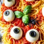 - Combine and Serve: Toss the cooked spaghetti noodles with the warm sauce. Serve the spaghetti on plates and decorate the top with the mozzarella ‘eyeballs’ for a festive Halloween presentation.