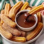 - Serve: Serve warm churros with the chocolate dipping sauce on the side for dipping.