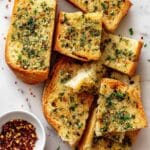 I recommend using crusty breads like a baguette, Italian loaf, or ciabatta since they hold up well to the garlic butter and baking process. Soft sandwich bread tends to get soggy quickly and doesn’t crisp up the same way. Look for a loaf with a nice crust and firm crumb for the best texture.