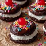 Indulge in these decadent Hot Fudge Sundae Cookies, featuring rich cocoa-infused cookie base topped with creamy frosting, drizzled hot fudge, colorful sprinkles, and a maraschino cherry on top. Perfect for dessert lovers craving a nostalgic ice cream sundae flavor in cookie form.