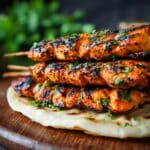 This Indian Tandoori Chicken Tikka Kebab Skewers recipe features succulent chicken breast marinated in a vibrant blend of spices, yogurt, and fresh herbs. The chicken is infused with traditional Indian flavors like garam masala, turmeric, and Kashmiri chili powder, then grilled or cooked to juicy perfection. Perfect as a flavorful appetizer or main dish, these kebabs are garnished with fresh coriander for a burst of freshness.