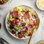 This Italian Brussels Sprouts Salad combines crisp shredded Brussels sprouts with a vibrant homemade Italian dressing, chickpeas, savory Genoa salami, fresh tomatoes, olives, pepperoncinis, red onions, and a blend of provolone and parmesan cheeses. It’s a refreshing and hearty salad perfect as a side dish or light meal packed with textures and bold Mediterranean flavors.