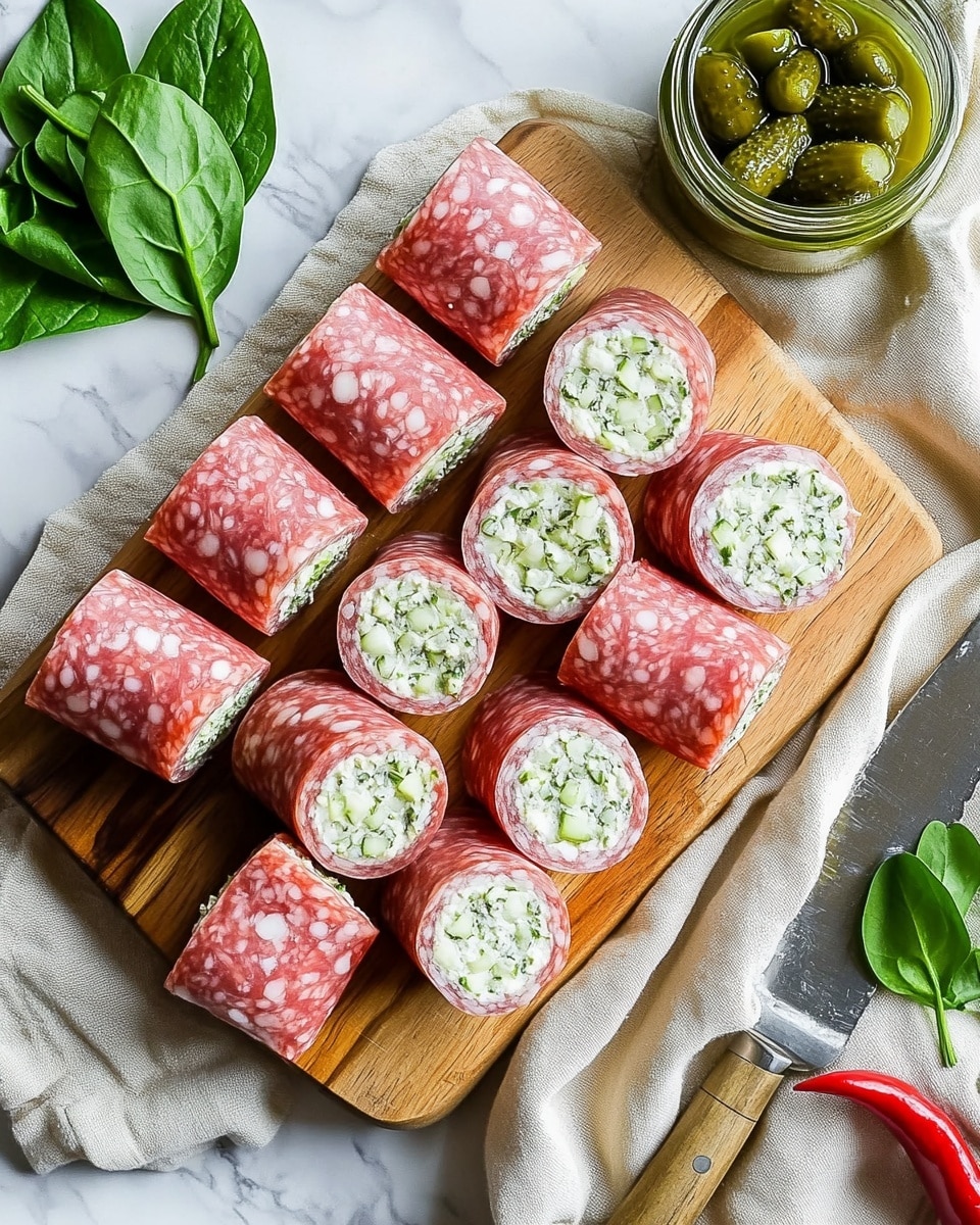 How to Serve Keto Salami Roll-Ups with Cream Cheese and Dill Pickles Recipe