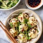 These Korean Chicken Steamed Bao Buns are soft, fluffy, and filled with a flavorful blend of tender chicken thighs marinated in a sweet and spicy gochujang sauce. Perfectly steamed for a pillowy texture, they’re garnished with chili oil, toasted sesame seeds, scallions, and fresh cilantro for a delicious Korean-inspired snack or meal.