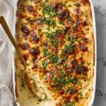 Once out of the oven, I like to carefully dab the top with a folded paper towel to soak up any excess oil that sometimes pools from the cheese and bacon. Sprinkle the fresh chives over the top for a pop of color and mild onion brightness. Let the casserole sit for about 10 minutes to let the sauce thicken back up, which makes serving those perfect slices much easier.