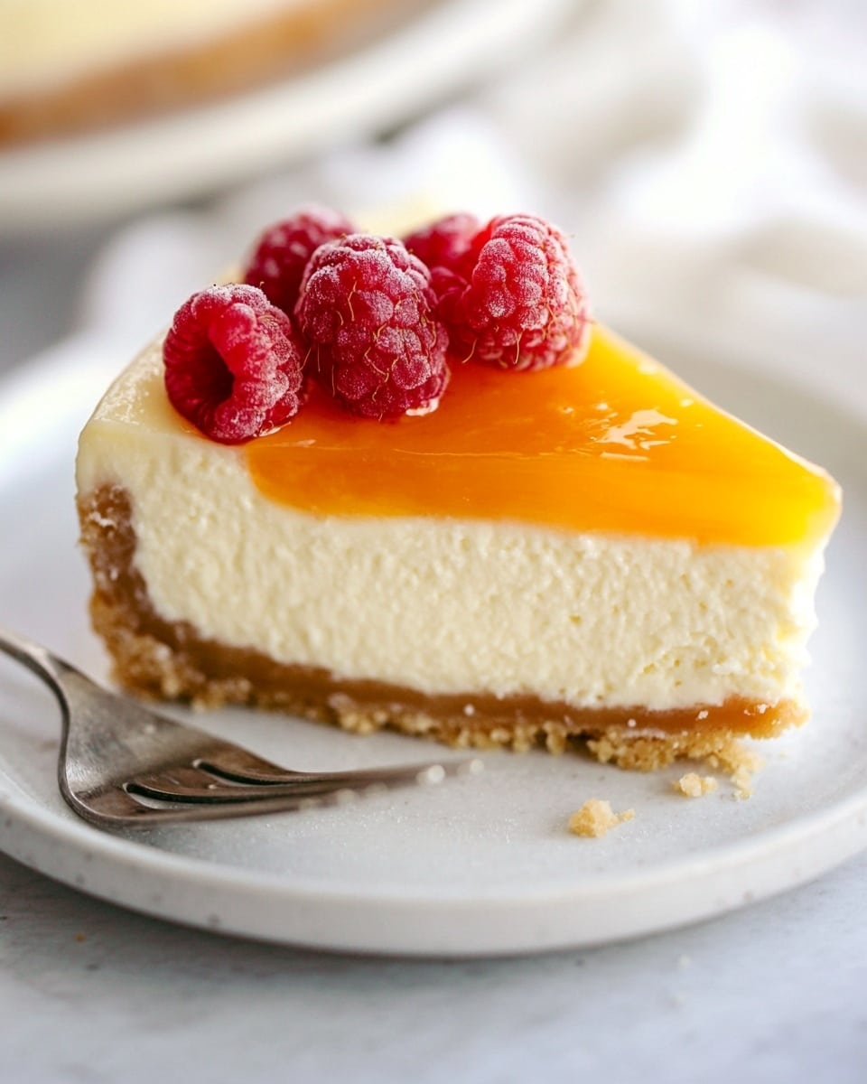 - Serve: Garnish the finished cheesecake with sliced ripe mangos, fresh raspberries, and a sprinkle of unsweetened coconut flakes. Slice and serve chilled for the best flavor and texture.