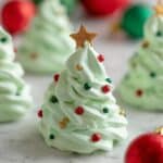 - Add decorations. While the meringue is still soft, decorate with optional round and star sprinkles to mimic ornaments and a tree topper, adding a festive touch.